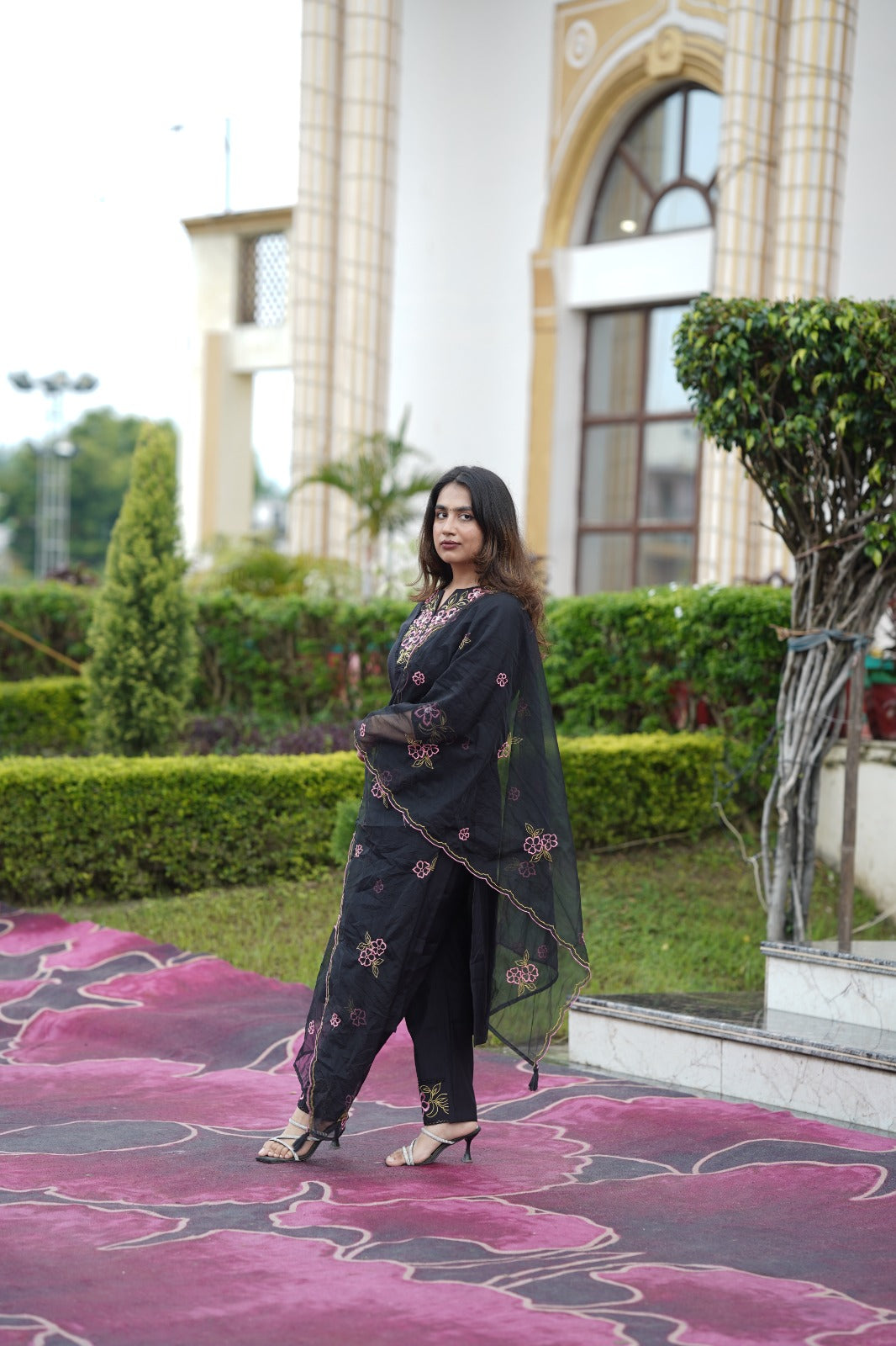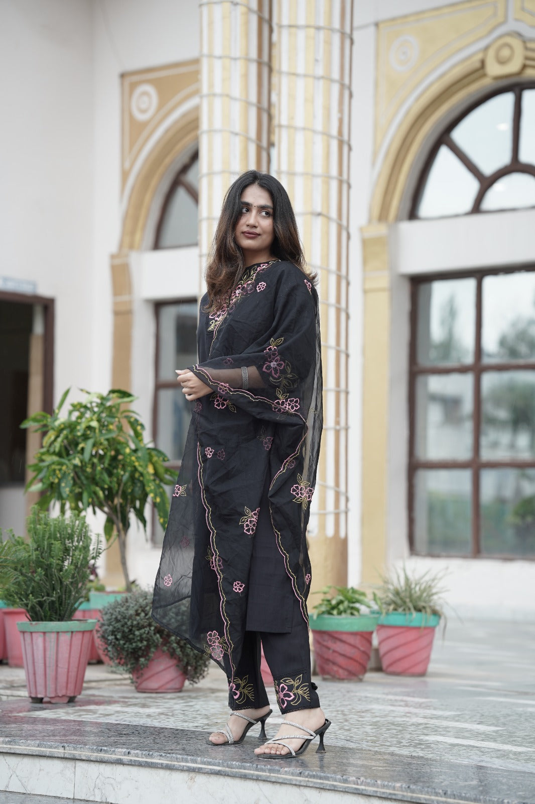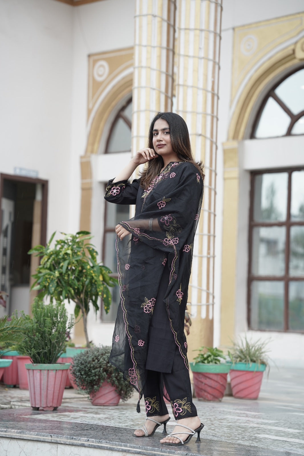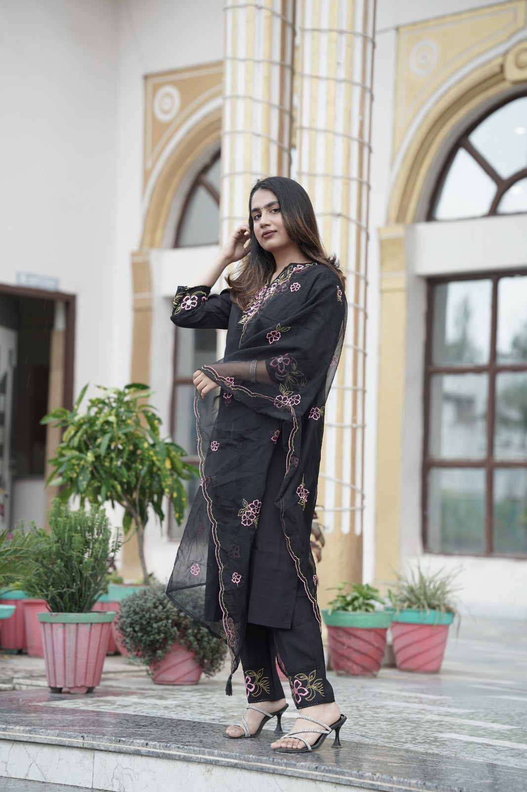 Elegant black organza kurta with beautifully crafted thread embroidery on the neckline, paired with a matching organza embroidered dupatta and silk pants. This graceful ensemble is perfect for festive occasions and gatherings, offering a blend of sophistication and style.
