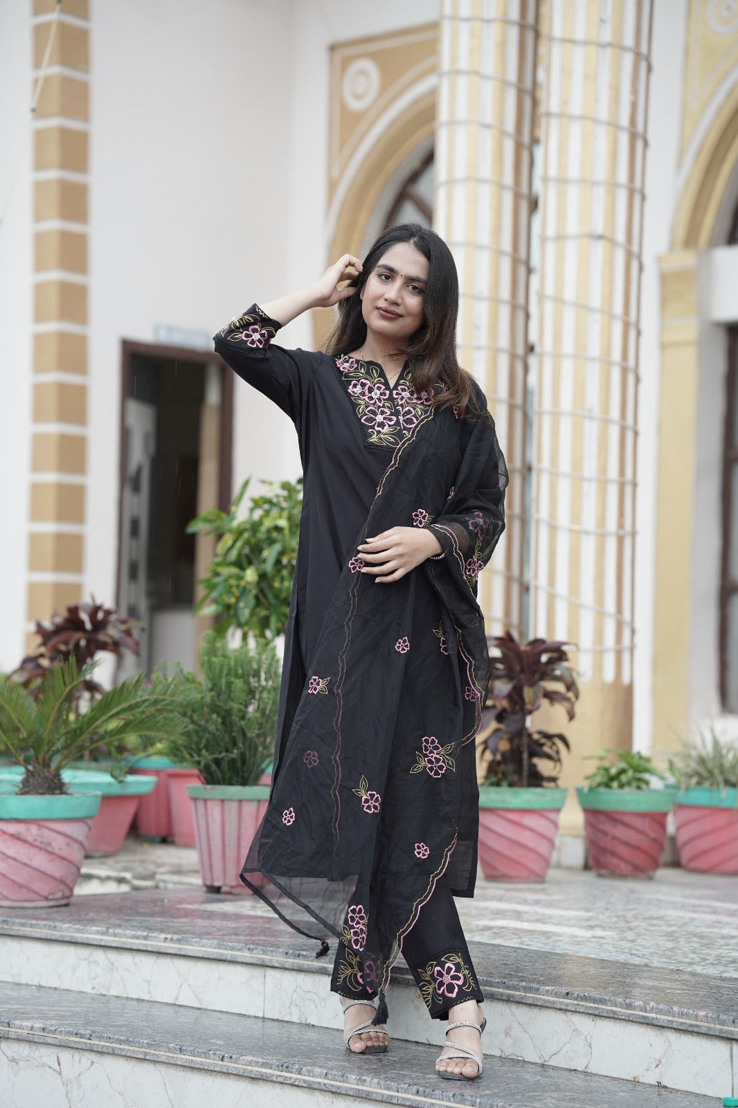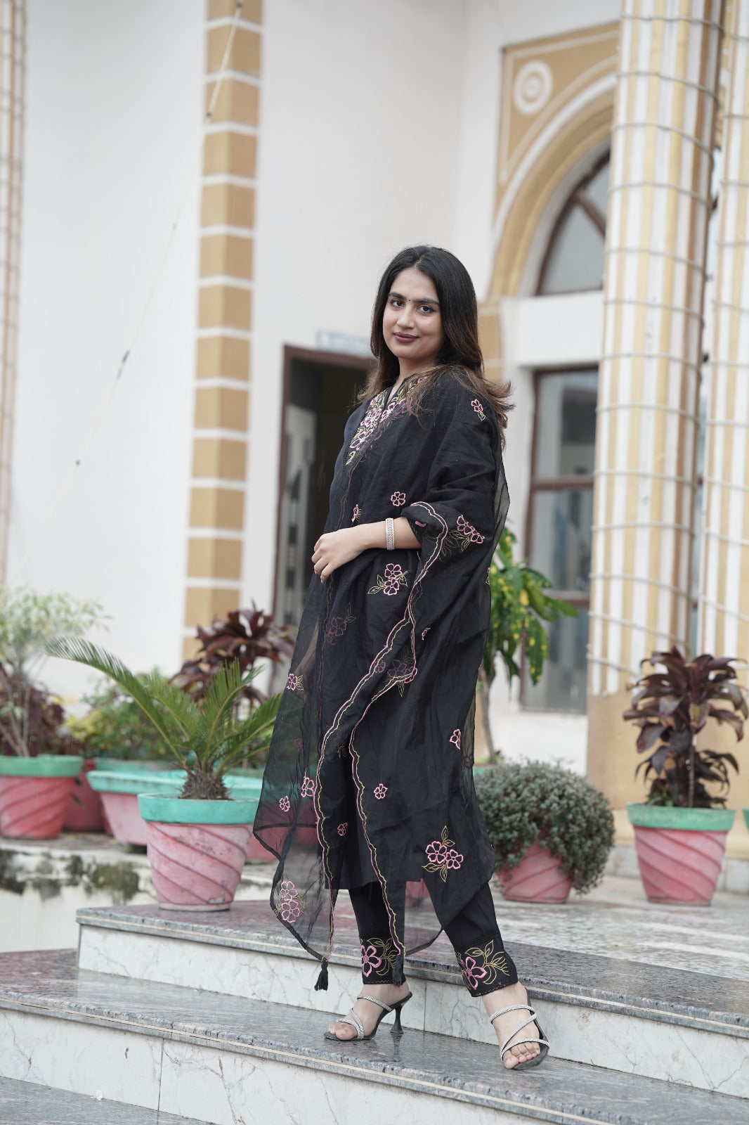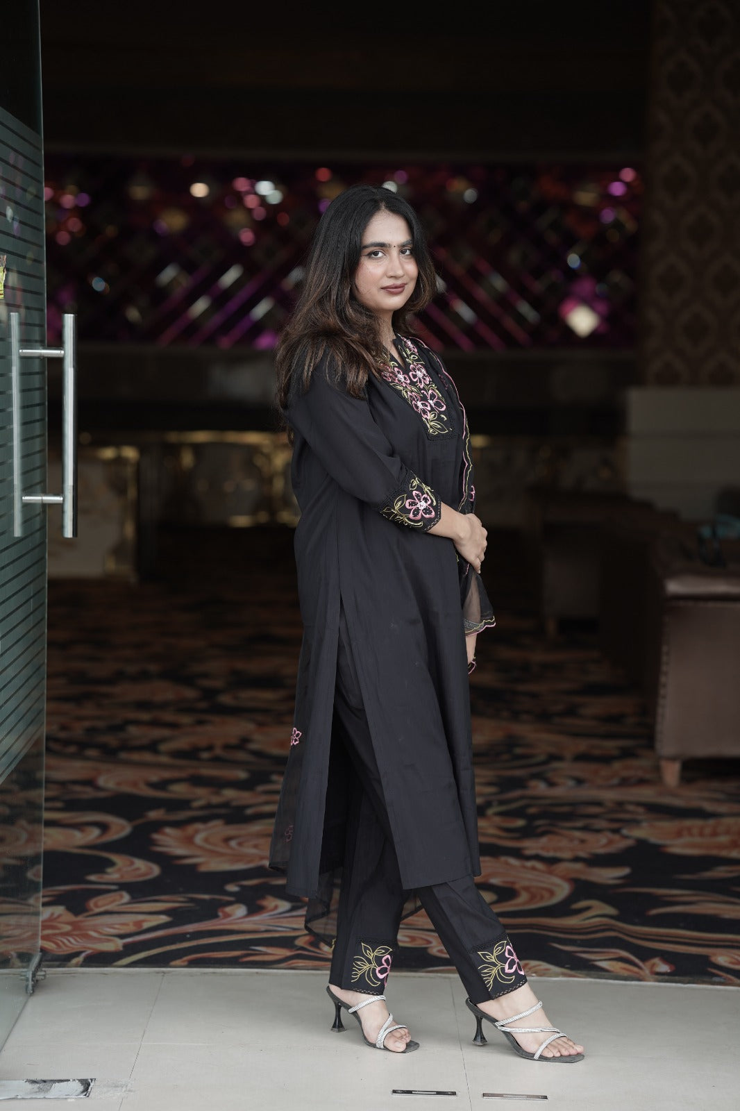Elegant black organza kurta with beautifully crafted thread embroidery on the neckline, paired with a matching organza embroidered dupatta and silk pants. This graceful ensemble is perfect for festive occasions and gatherings, offering a blend of sophistication and style.
