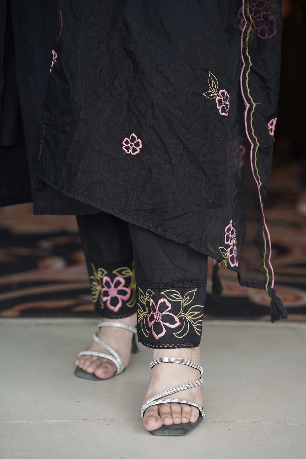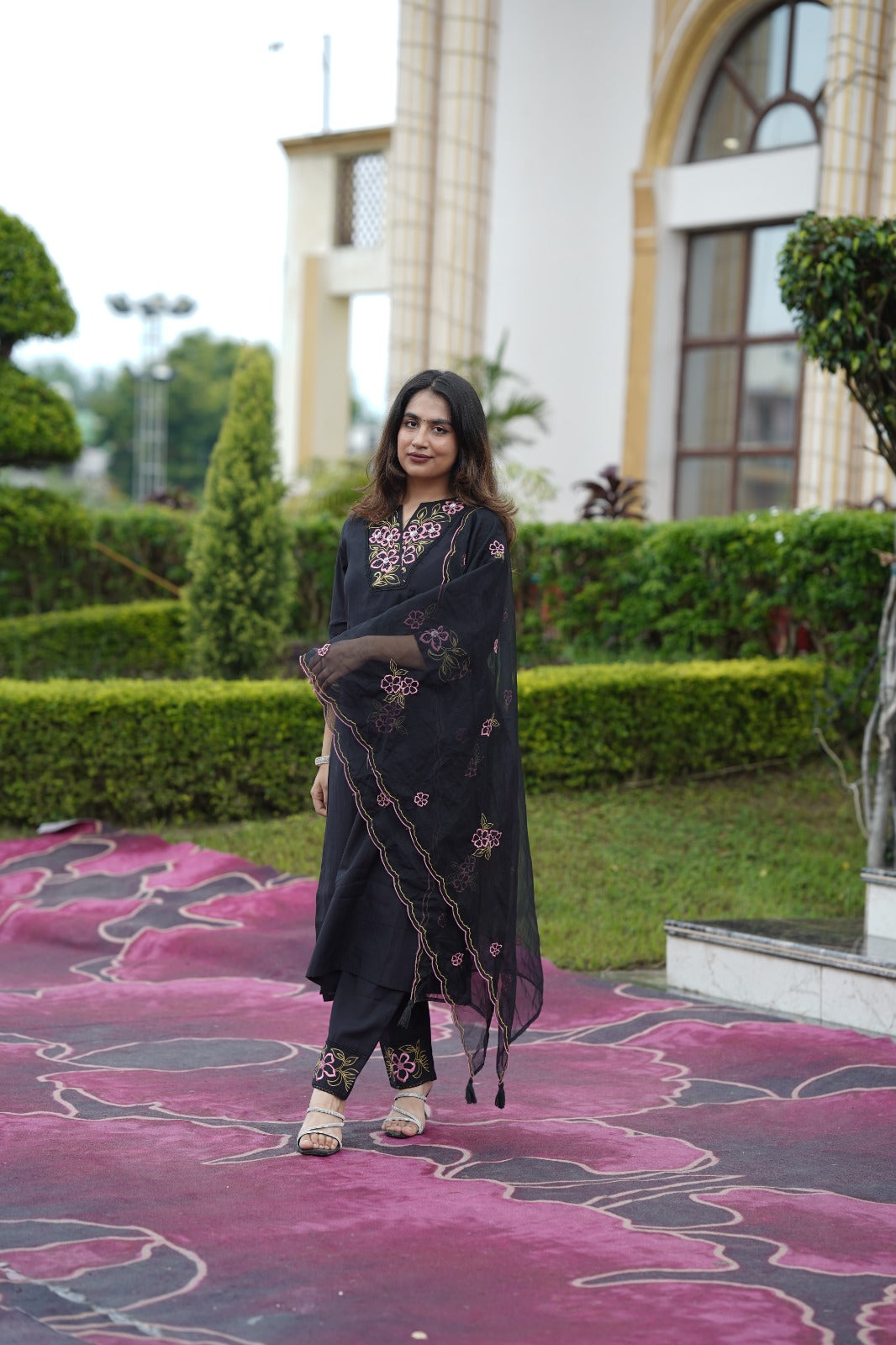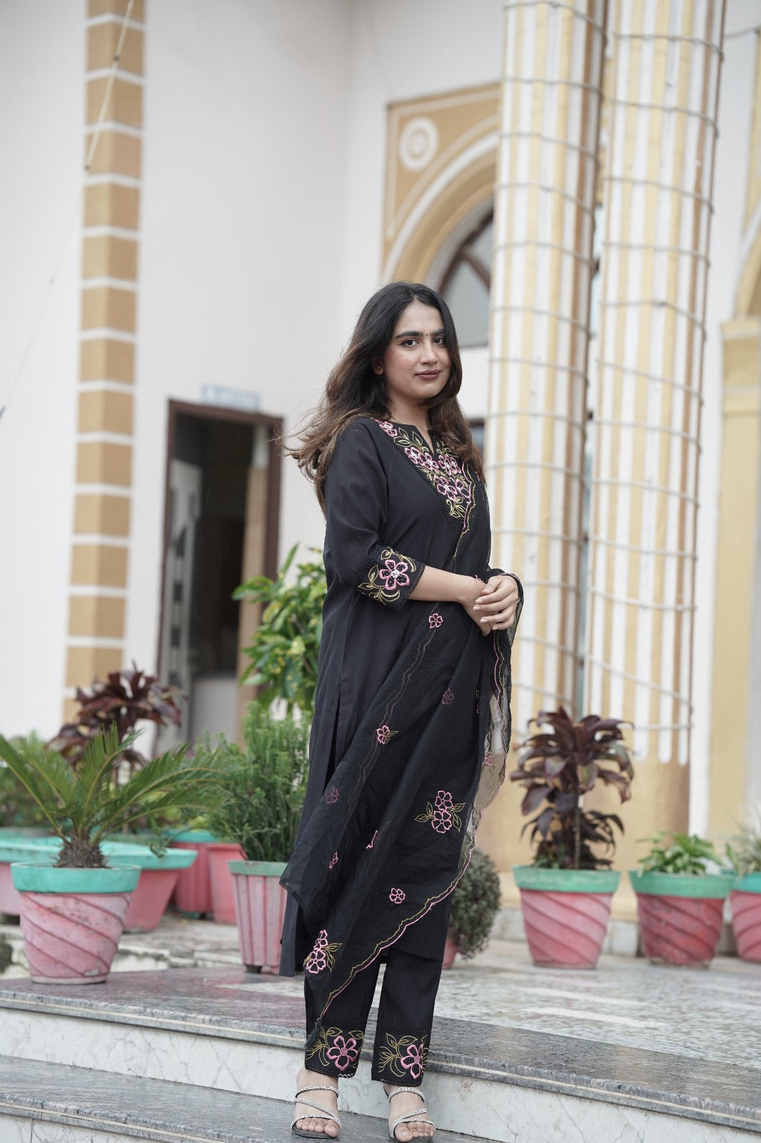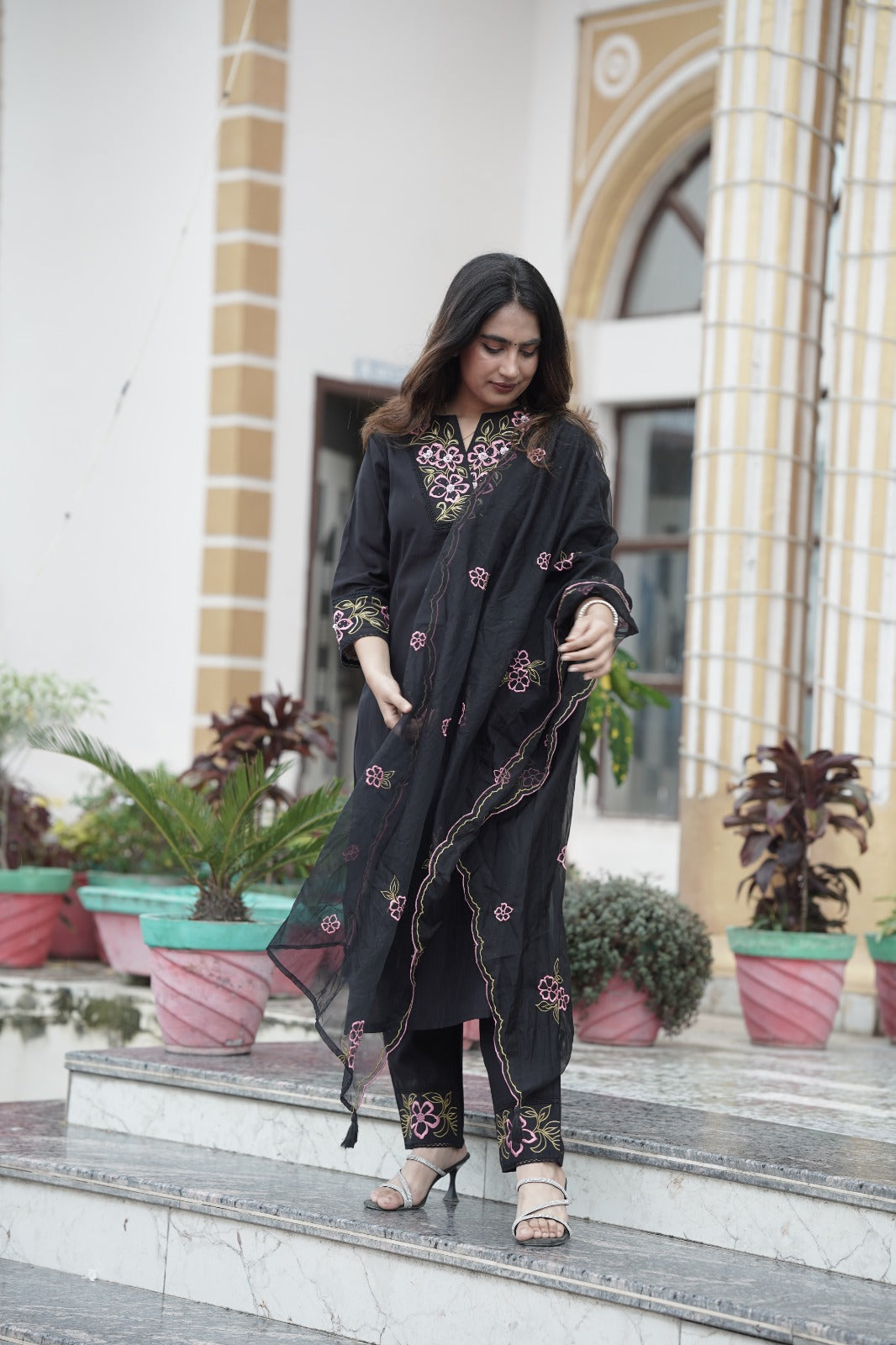 Elegant black organza kurta with beautifully crafted thread embroidery on the neckline, paired with a matching organza embroidered dupatta and silk pants. This graceful ensemble is perfect for festive occasions and gatherings, offering a blend of sophistication and style.
