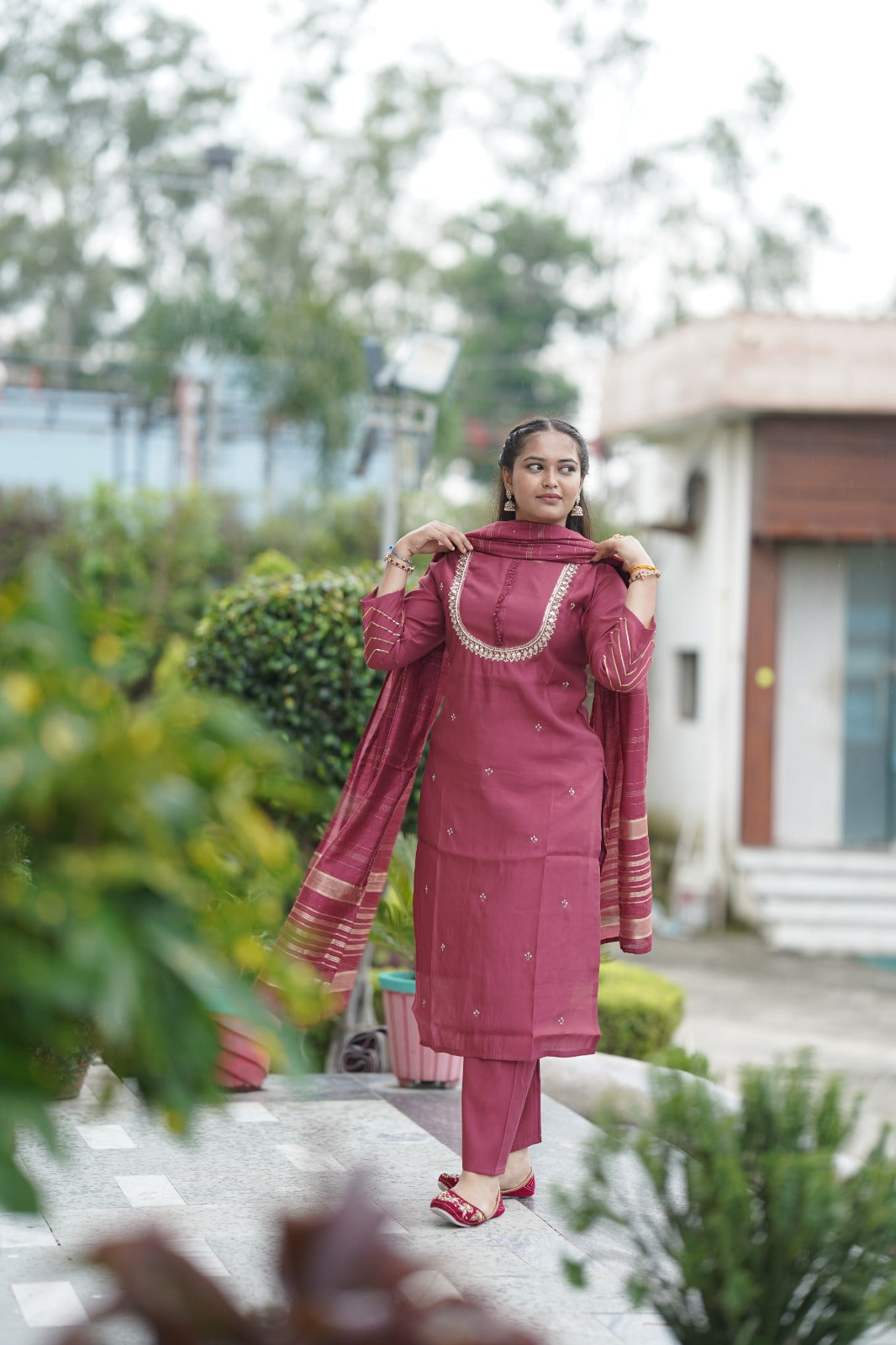 Elevate your ethnic wardrobe with this elegant Roman Silk Shirt featuring a unique neck design that adds a royal touch. Paired with soft silk pants and a silk self-design dupatta, this set is perfect for festive occasions, weddings, and special gatherings.